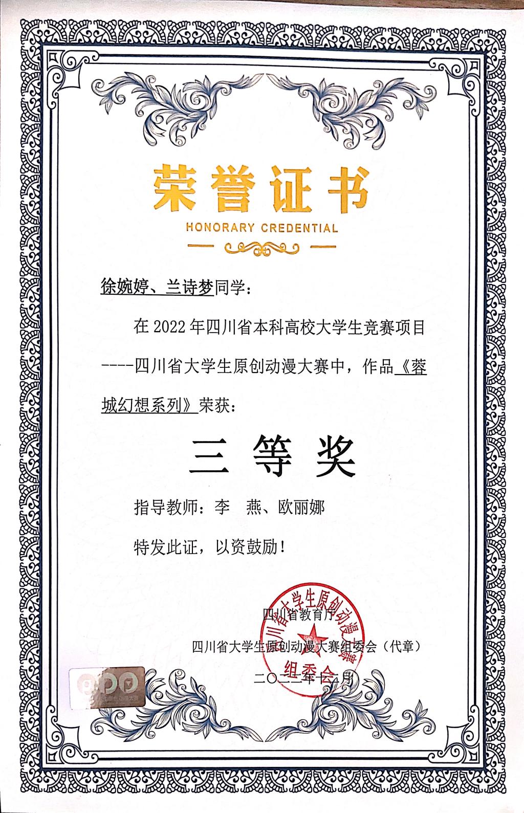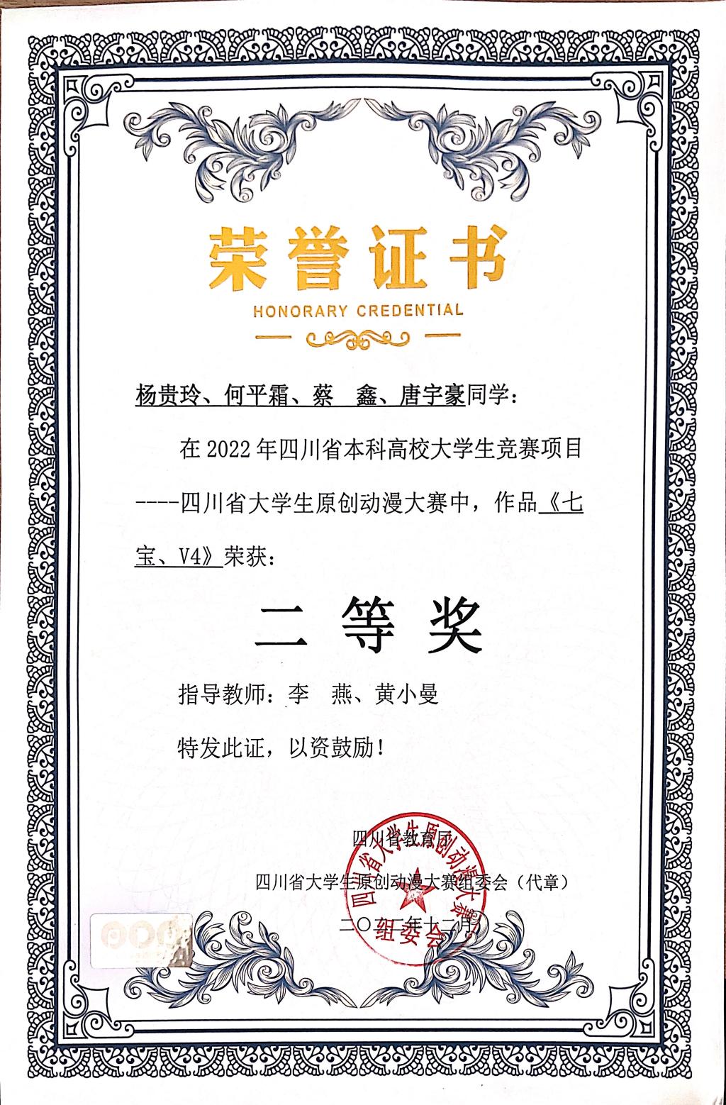 由李燕老师带队,黄小曼、欧丽娜老师指导的学生杨贵玲、唐宇豪、何平霜、蔡鑫、兰诗梦,经过激烈角逐,在四川省教育厅主办的四川原创动漫大赛中荣获二、三等奖各1项。