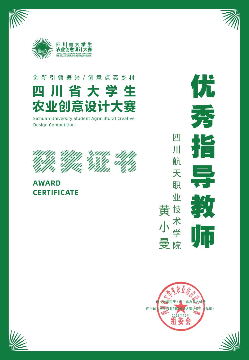 在四川省教育厅、四川省农业农村厅主办的四川省大学生农业创意设计大赛中,计算机科学系李燕、黄小曼、欧丽娜三位指导老师荣获优秀指导老师,参赛同学们获得一等奖3项,二等奖11项,三等奖22项,共39个奖项。